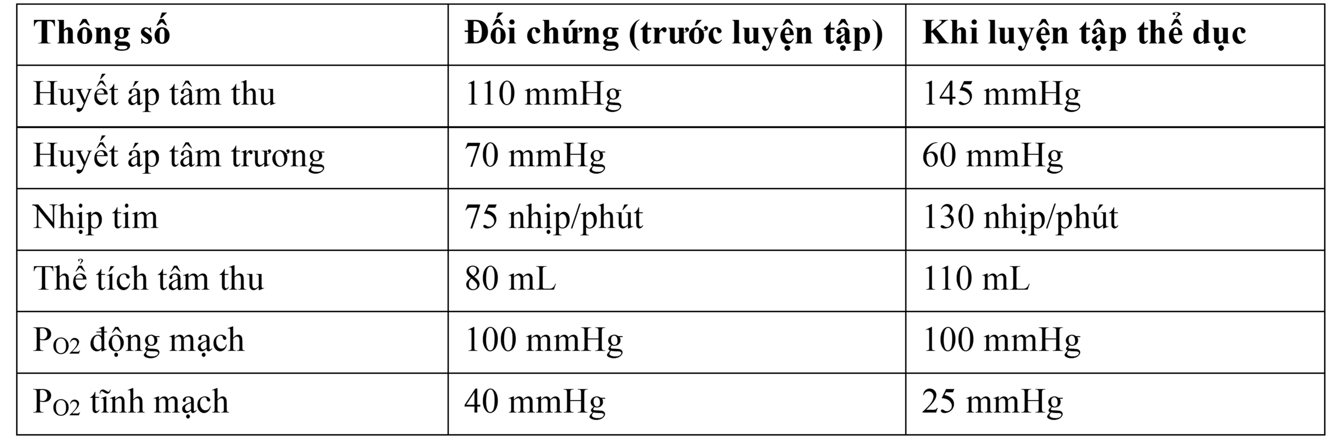 Trong một nghiên cứu về sự đáp ứng của hệ tim mạch với sự luyện tập thể dục, một người phụ nữ đáp ứng các tiêu chí nghiên cứu (từ 25 đến 40 tuổi, không dùng thuốc, cân nặng bình thường về chiều cao, huyết áp bình thường) được chọn để nghiên cứu. Các thông số đối chứng (trước luyện tập thể dục) về huyết áp, nhịp tim và PO2 động mạch và tĩnh mạch, thể tích tâm thu của cô ta được xác định. Sau đó người phụ nữ này đi trên một máy chạy bộ trong thời gian 30 phút với vận tốc 3 dặm/h. Huyết áp và nhịp tim của cô được theo dõi liên tục, PO2 động mạch và tĩnh mạch của cô được đo vào cuối giai đoạn tập thể dục. (Bảng dưới đây)