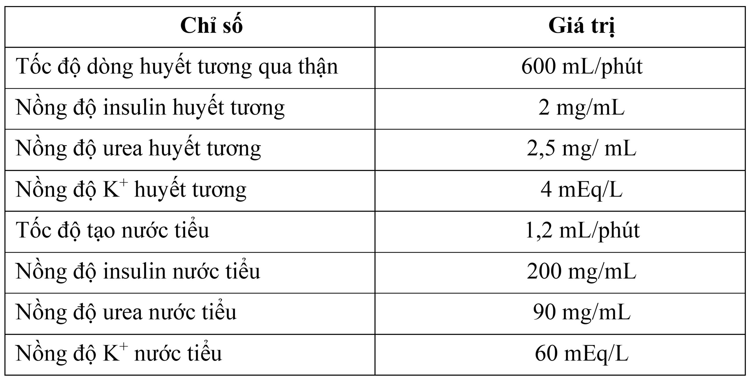 Insulin là chất được sử dụng để xác định tốc độ lọc ở cầu thận do toàn bộ insulin trong huyết tương đều được lọc qua cầu thận và không được tái hấp thu. Quá trình tái hấp thu urea ở ống thận được thực hiện theo cơ chế khuếch tán. Quá trình bài tiết ion K+ ở ống thận theo cơ chế vận chuyển chủ động. Bảng 1 thể hiện kết quả phân tích một số chỉ số liên quan đến bài tiết và tuần hoàn máu ở thận của một người bình thường khoẻ mạnh.