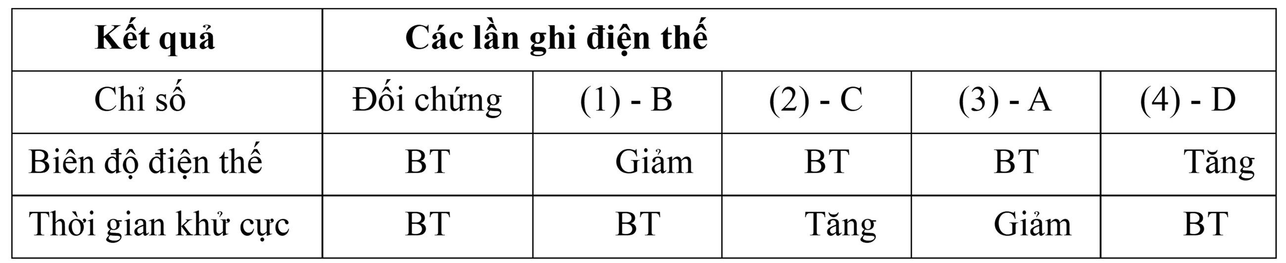 Bảng dưới đây bao gồm các kết quả của các lần ghi điện thế khử cực cấp độ của màng sau synapse neuron khi sử dụng kích thích đơn lẻ giống nhau tác động lên neuron trước xináp trong trường hợp mặt của từng chất (A, B, C, D) và không có mặt của chất (đối chứng). Biết rằng điện thế cấp độ có biên độ (độ lớn) và thời gian khử cực thay đổi tương ứng với số lượng và thời gian tồn tại của chất truyền tin thần kinh được giải phóng ở khe synapse; thời gian tồn tại của chất truyền tin thần kinh không phụ thuộc vào số lượng của nó. Các mức "Giảm" hoặc "Tăng" ở trong bảng là khác biệt rõ ràng (có ý nghĩa thống kê) so với mức "BT" (bình thường).