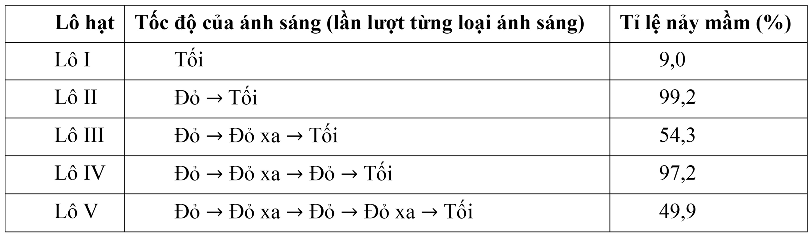 Để nghiên cứu tác dụng của ánh sáng đỏ (chiếu trong 1 phút) và ánh sáng đỏ xa (chiều trong 4 phút) lên sự nảy mầm của hạt rau diếp, nhà khoa học H.A. Borthwichk đã chiếu sáng 5 lô hạt (đã được làm ấm và đồng đều về phẩm chất) theo chế độ chiếu sáng như ở bảng dưới. Sau khi chiếu sáng, các hạt được đặt trong tối 2 ngày với điều kiện tối ưu về nhiệt độ và độ ẩm. Tỉ lệ nảy mầm của hạt được trình bày trong bảng dưới.