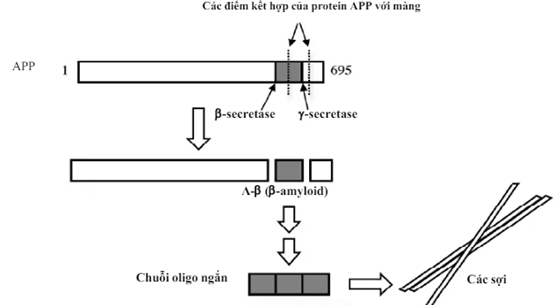 B, Protein tiền thân APP bị cắt bởi các enzyme β-secretase và γ-secretase, tạo ra peptide A-β, sau đó peptide này kết hợp thành các sợi amyloid có tính độc.