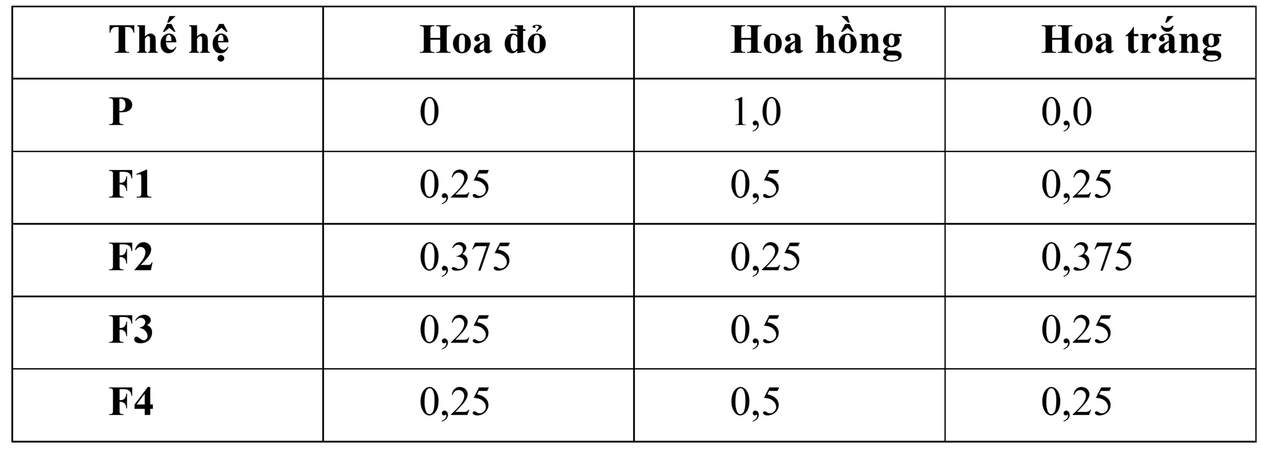 Trong trường hợp này, tỉ lệ hoa đỏ, hồng và trắng có sự biến động qua các thế hệ (đặc biệt là từ F1 đến F2) và sau đó thấy rằng quần thể này có sự ổn định và ở trạng thái cân bằng di truyền. Đáp án: B
