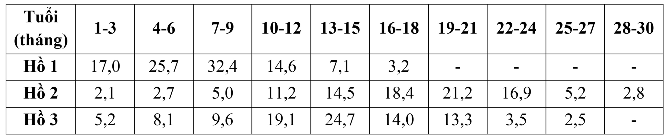Để đánh giá tiềm năng khai thác quần thể cá trê ở 3 hồ nước ngọt có điều kiện tự nhiên tương đương nhau, người ta đã sử dụng cùng một cách đánh bắt, ở cùng một thời điểm rồi phân loại số cá bắt được theo nhóm tuổi (tính theo tỉ lệ %). Biết rằng, tuổi thành thục sinh sản của cá trê là 12 – 15 tháng và số lượng cá đánh bắt ở 3 hồ trong nghiên cứu đảm bảo tin cậy về thống kê. Kết quả điều tra được trình bày ở bảng dưới đây:
