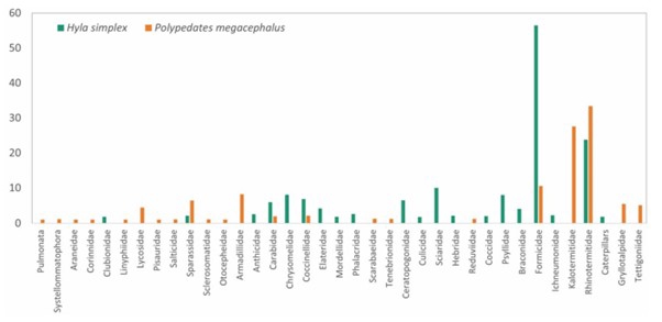 Nhóm nghiên cứu đã định loại được tổng cộng 134 con mồi là thức ăn của loài H. simplex (131 con mồi là động vật không xương sống và 03 con mồi không xác định) thuộc 20 họ khác nhau của 7 bộ động vật không xương sống. Ở loài P. megacephalus, thu được tổng cộng 218 con mồi (215 con mồi là động vật không xương sống và 03 con mồi không xác định) thuộc 22 họ của 11 bộ không xương sống.