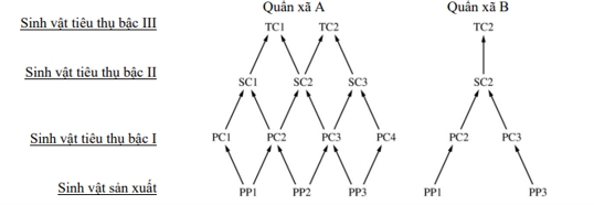 Hai quần xã sinh vật là A và B được nghiên cứu và xây dựng các lưới thức ăn dưới đây từ đó đánh giá tác động các hoạt động của con người lên quần xã. Cho rằng, sinh khối ban đầu của cả 2 quần xã là như nhau.