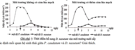 C, Ở môi trường không có cám lúa mạch, P.caudatum bị tiêu diệt hoàn toàn, còn ở môi trường có cám lúa mạch, số lượng P.caudatum và D.nasutum đều đạt trạng thái cân bằng.