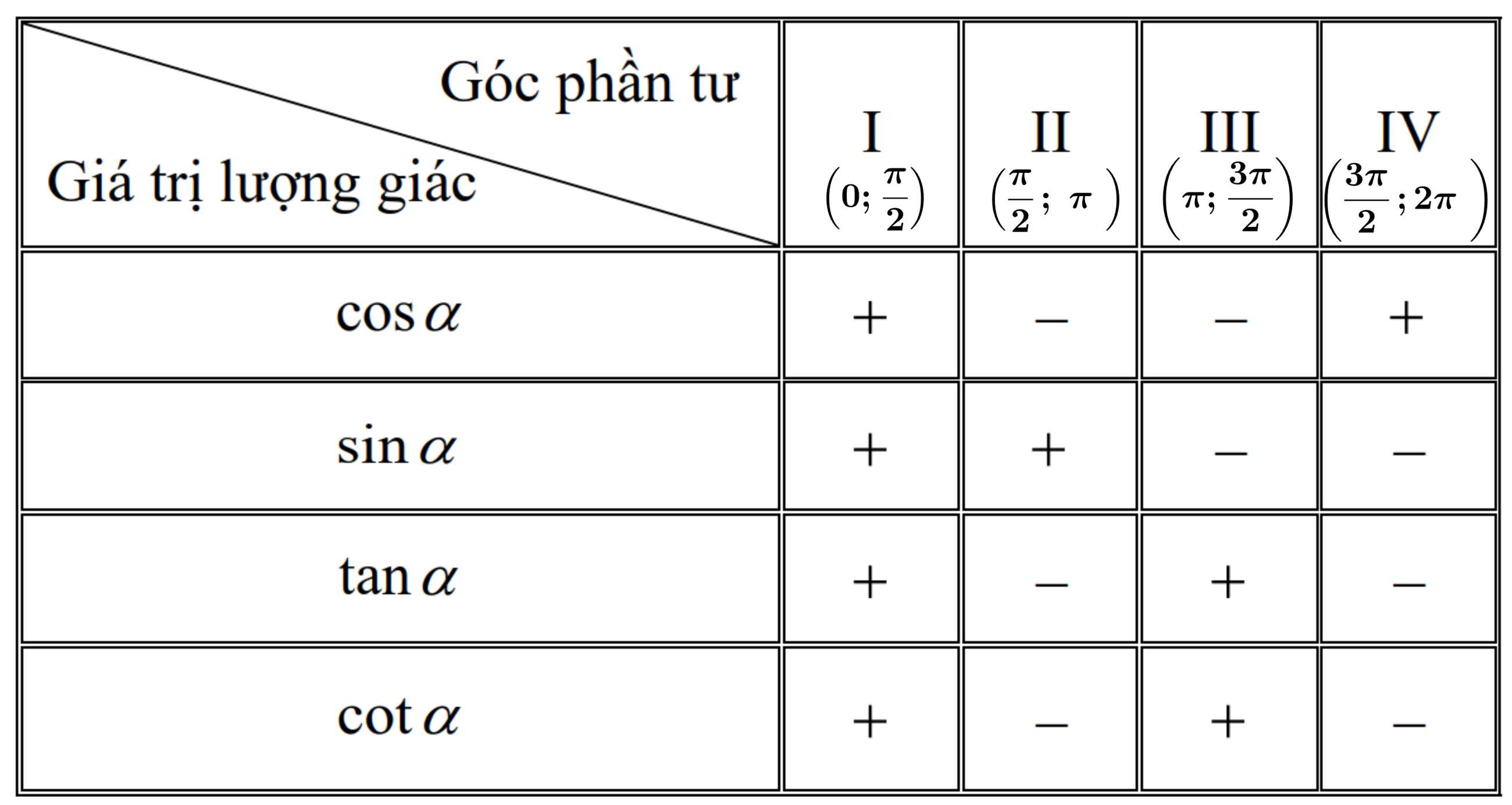 Ta có bảng xét dấu giá trị lượng giác sau: