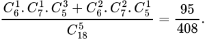 Câu 14 [792235]: Một hộp có 5 viên bi xanh, 6 viên bi đỏ và 7 viên bi vàng. Chọn ngẫu nhiên 5 viên bi trong hộp, tính xác suất để 5 viên bi được chọn có đủ 3 màu và số bi đỏ bằng số bi vàng.